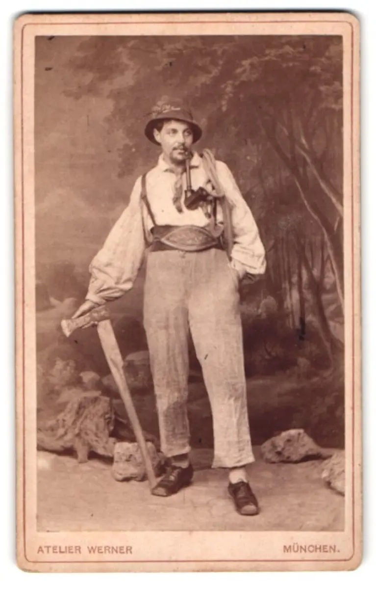 Fotografie Atelier Werner, München, junger Mann als Holzknecht mit Axt und Pfeife in Tracht