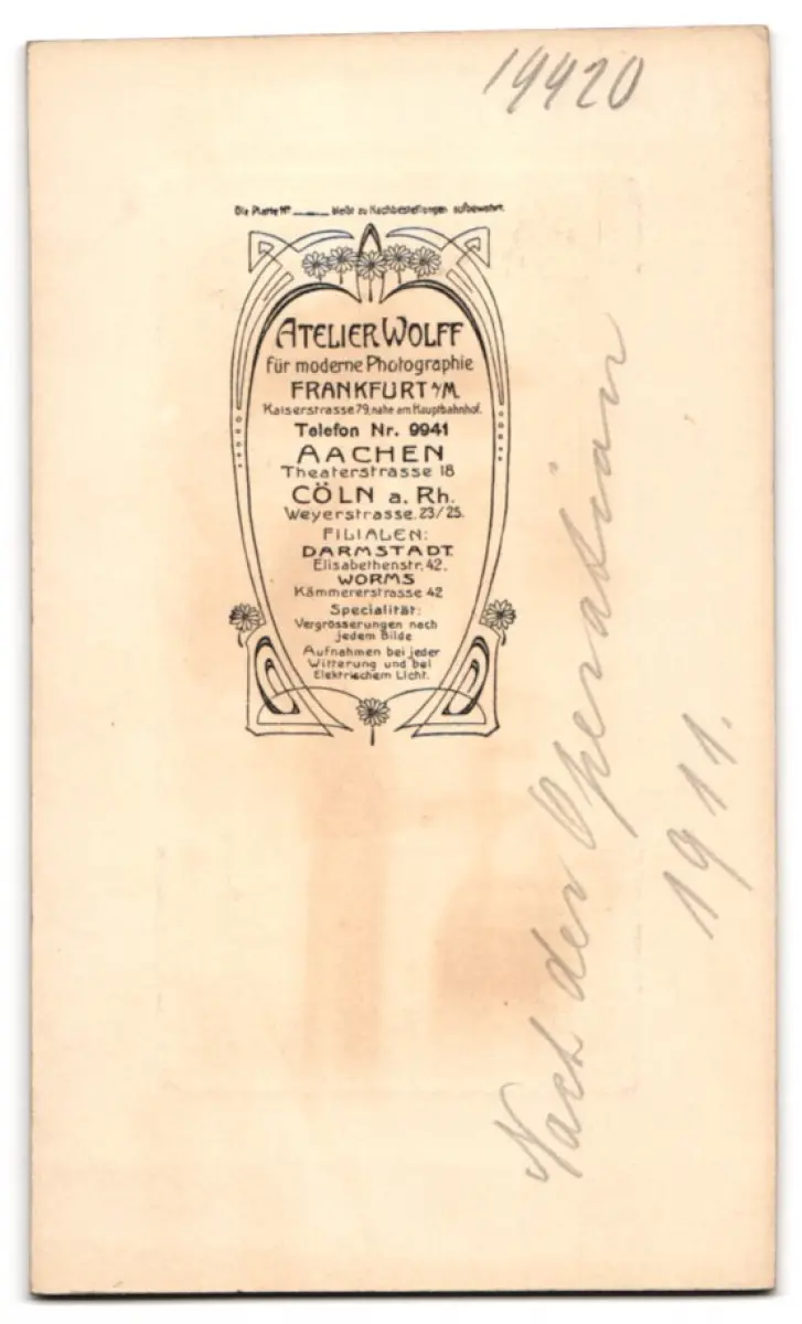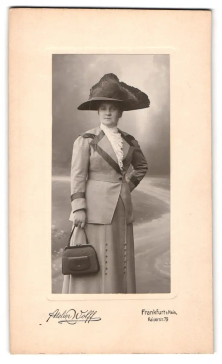 Fotografie Atelier Wolff, Frankfurt am Main, Kaiserstr. 79, elegante Dame mit Hut und Handtasche