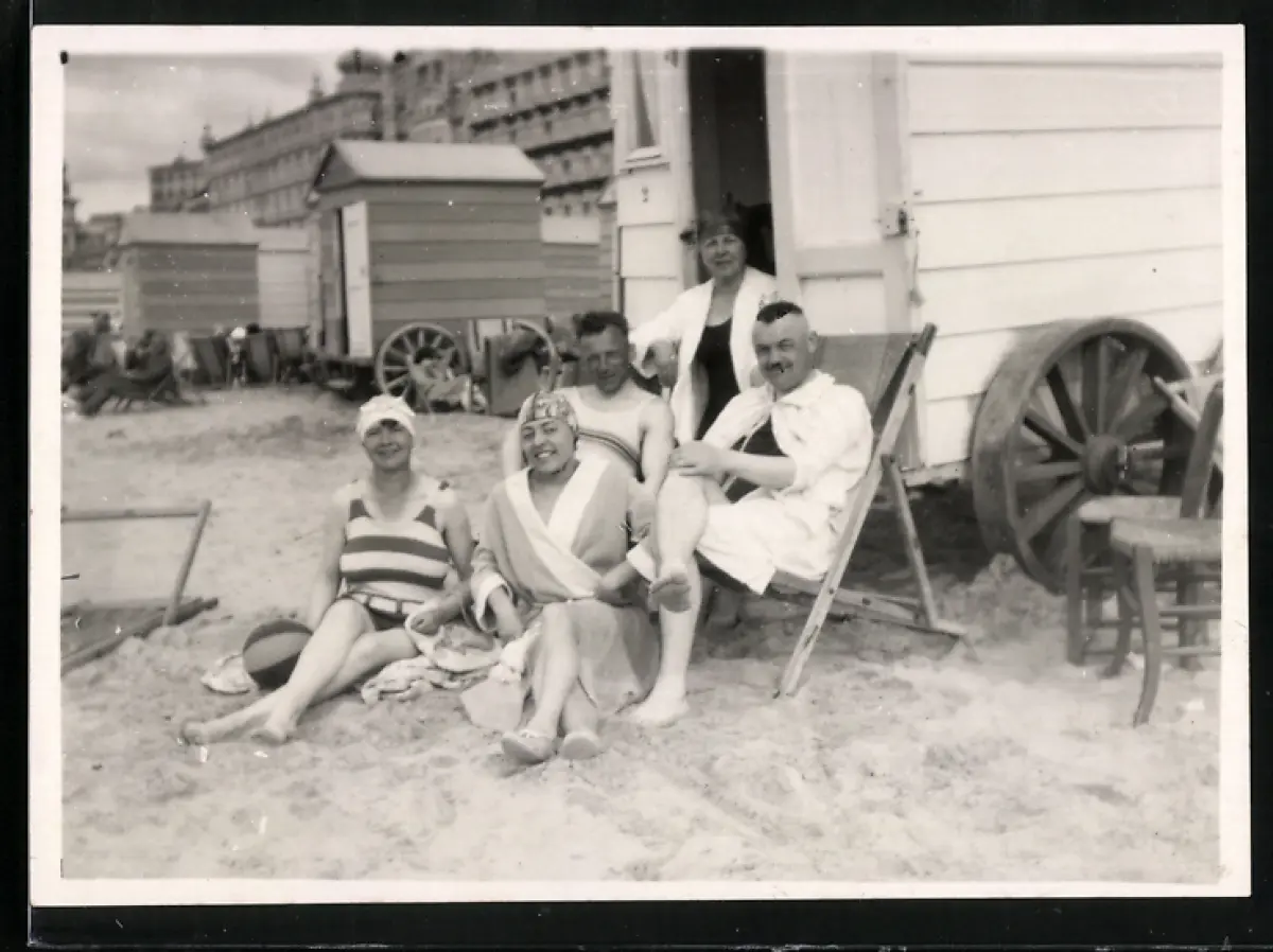 Fotografie Badegäste in Bademode an ihrem Badekarren