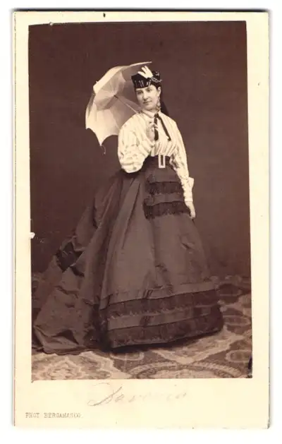 Fotografie Bergamasco, St. Petersburg, Schauspielerin im Kleid mit Hut und Schirm