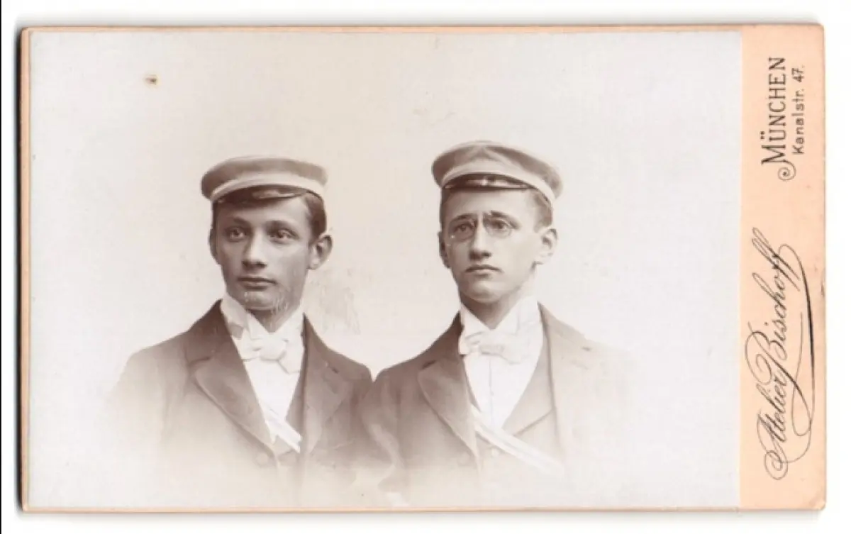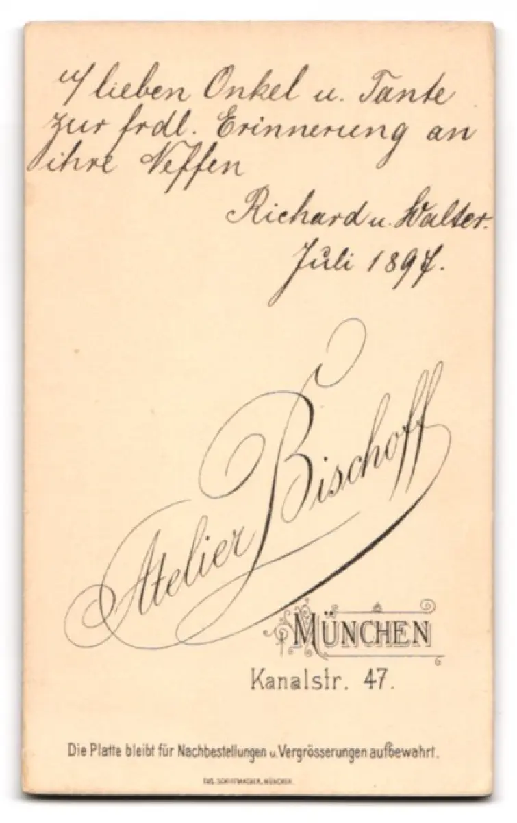 Fotografie Bischoff, München, Portrait zwei junge Studenten Richard und Walter mit Couleur, 1897