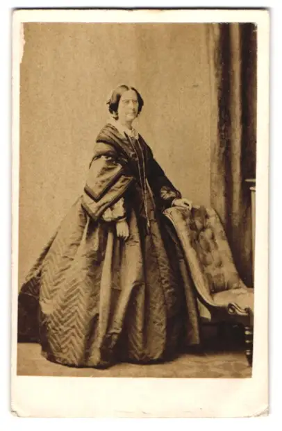 Fotografie C. R. Pottinger, Cheltenham, englische Dame im gemusterten Reifrockkleid mit Halskette