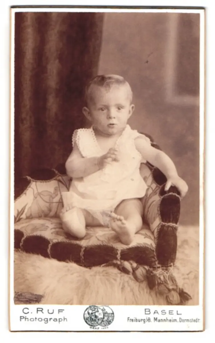 Fotografie C. Ruf, Basel, Steinenthorweg, Kleinkind auf gepolstertem Stuhl