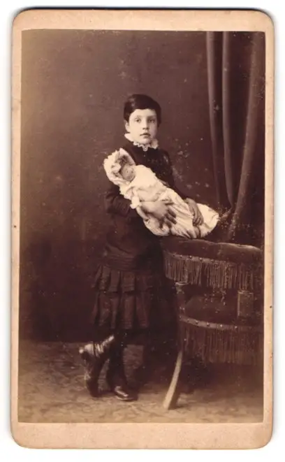 Fotografie C. T. Gibbs, Stroud, junges englisches Mädchen mit ihrer Puppe im Arm, wie die Mama