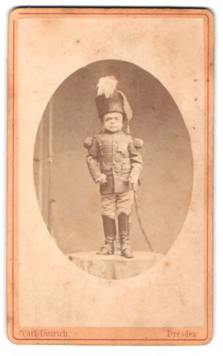 Fotografie Carl Dittrich, Dresden, Kleinwüchsiger in Husaren Uniform mit Orden und Kolpak