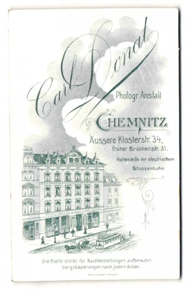 Fotografie Carl Donat, Chemnitz, Äussere Klosterstr. 34, Ansicht Chemnitz, Blick auf das Atelierhaus mit Strassenbahn