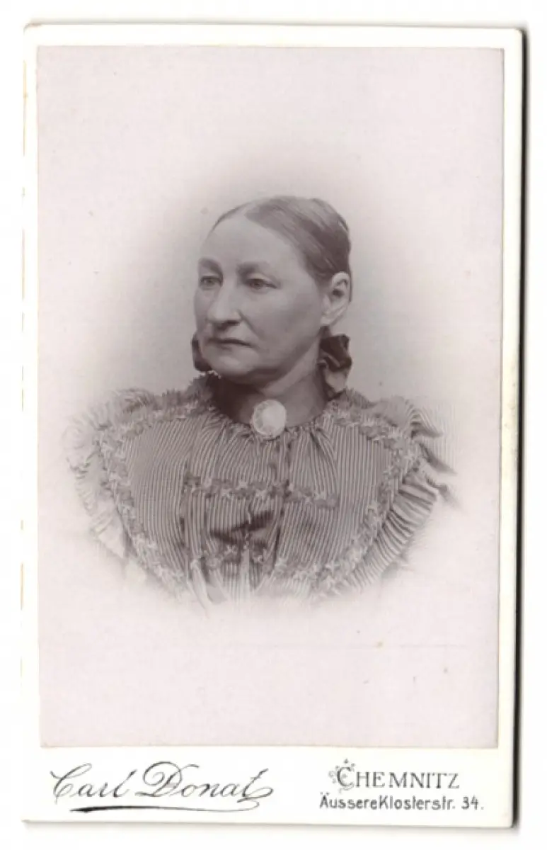 Diese CDV Fotografie zeigt das ausdrucksstarke Porträt einer Dame, die in raffinierter Weise das Modebewusstsein ihrer Zeit widerspiegelt. Ihre Haare sind glatt zurückgekämmt, und sie trägt eine kunstvoll gestaltete Bluse mit zarten Rüschen und einem dekorativen Verschluss am Kragen. Die Komposition des Bildes lenkt den Blick auf die feinen Details der Kleidung und die ruhige Ausstrahlung der dargestellten Person., guter Zustand Größe ca. 7,0 x 11,0cm