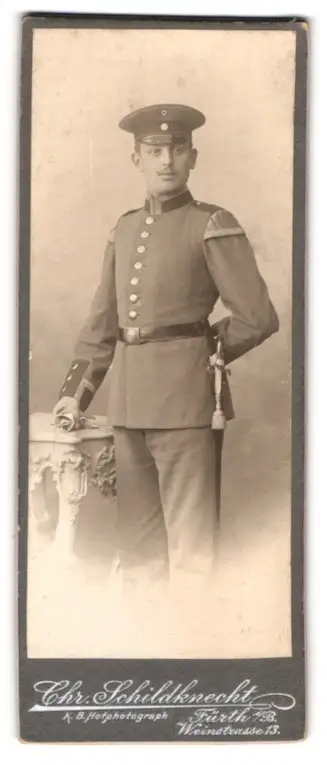 Fotografie Chr. Schildknecht, Fürth i. B., Weinstr. 13, Uffz. Musiker in Uniform mit Schwalbennest
