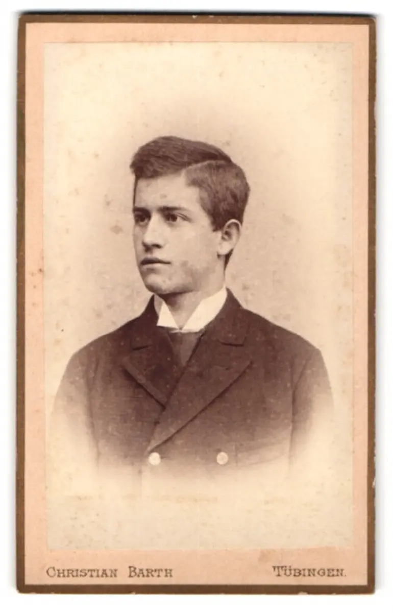 Diese CDV Fotografie zeigt das eindrucksvolle Porträt eines jungen Mannes in einem eleganten Anzug. Mit ernstem Blick und sorgfältig frisiertem Haar strahlt er eine stille Entschlossenheit aus., guter Zustand