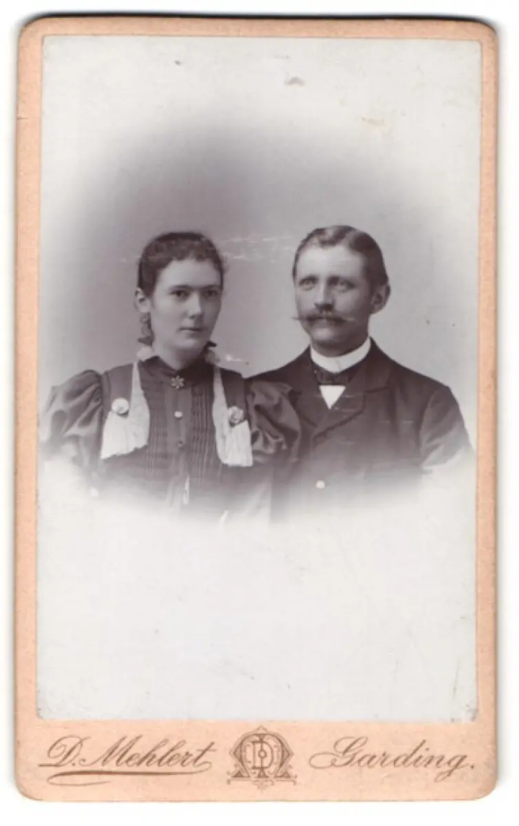 In dieser CDV Fotografie zeigt sich ein würdiges Paar in eleganter Pose. Der Herr, gekleidet in einen dunklen Anzug, präsentiert mit Stolz seinen markanten Schnurrbart. An seiner Seite steht eine Dame in einem kunstvoll gestalteten Kleid mit dekorativen Details. Beide blicken ernst in die Kamera und vermitteln eine zeitlose Eleganz, die den Betrachter in ihren Bann zieht., guter Zustand Größe ca. 6,5 x 10,5cm