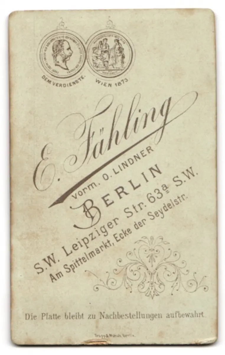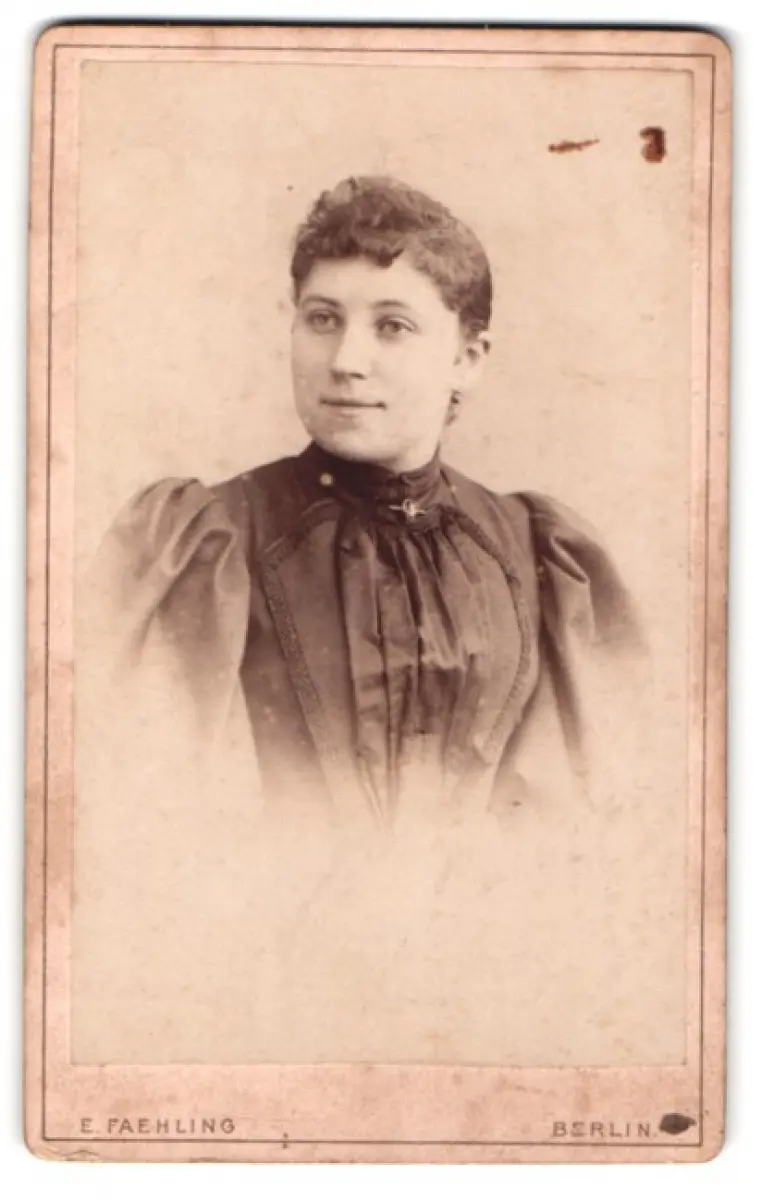 Fotografie E. Faehling, Berlin, SW. Leipziger Str. 63a, Porträt einer Frau in dunklem Kleid