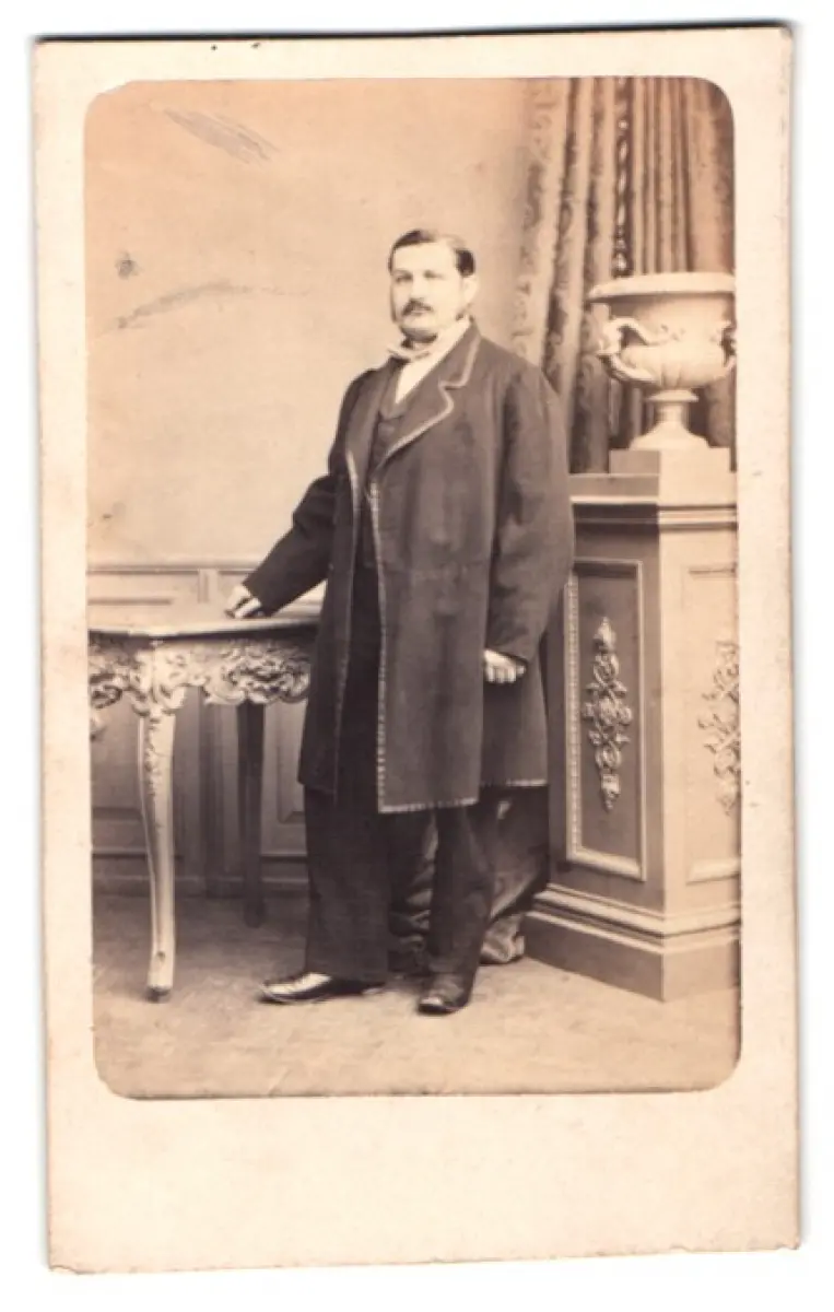 Diese CDV Fotografie zeigt einen distinguierten Herrn, der neben einem kunstvoll verzierten Tisch steht. Seine Haltung strahlt Ruhe und Selbstbewusstsein aus. Der Hintergrund ist elegant gestaltet mit einem schweren Vorhang und einer dekorativen Säule, die den Rahmen für diese klassische Komposition bilden. Sein langer Mantel und die sorgfältige Frisur unterstreichen seinen wohlhabenden und respektablen Auftritt., guter Zustand