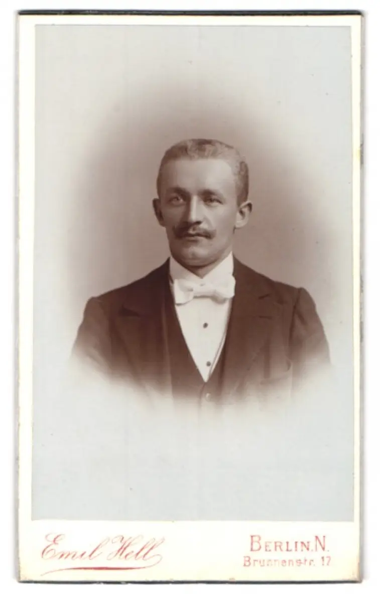 Diese Carte de Visite Fotografie zeigt einen distinguierten Herrn in einem dunklen Anzug, versehen mit einer eleganten Fliege und einem weißen Hemd. Sein Haar ist sorgsam frisiert, und ein gepflegter Schnurrbart ziert sein Gesicht. Der Ausdruck des Mannes strahlt Ruhe und Würde aus, eingefangen in einem sanften, ovalen Bildausschnitt, der ihm eine zeitlose Präsenz verleiht., guter Zustand Größe ca. 6,5 x 11,0cm