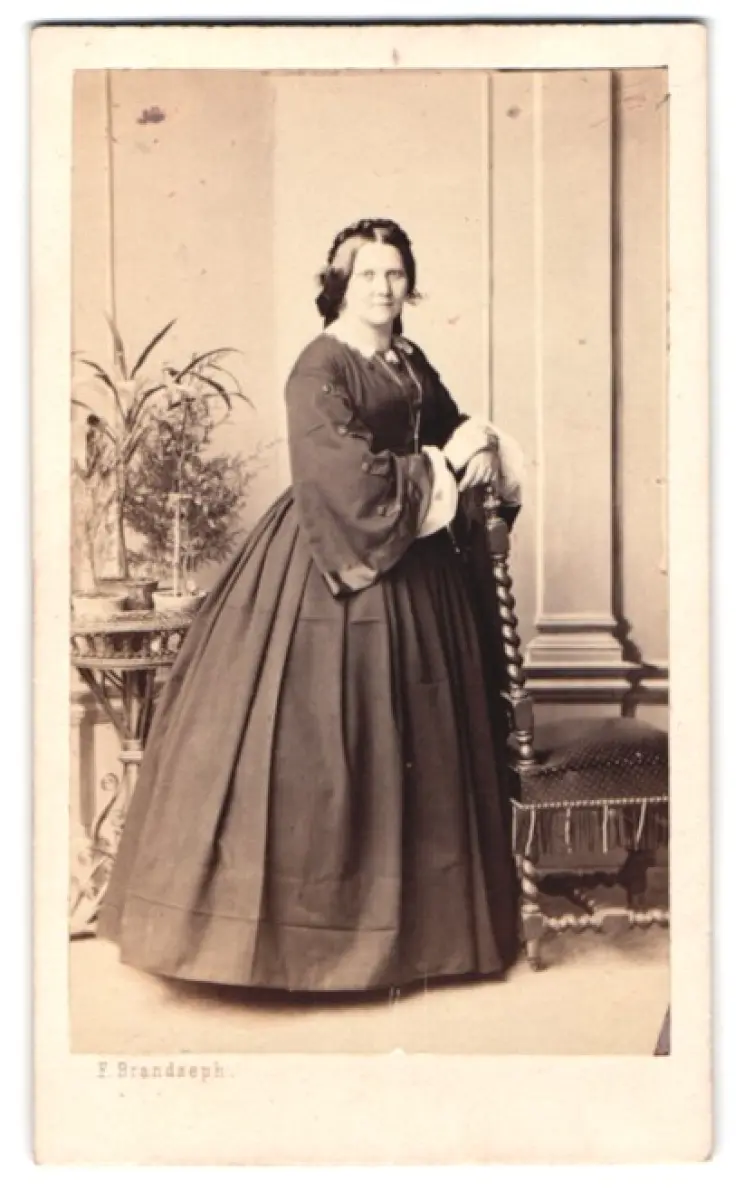 Diese CDV Fotografie zeigt eine ehrwürdige Dame, die in einem prächtigen, bodenlangen Kleid posiert. Sie steht anmutig neben einem kunstvoll geschnitzten Stuhl und ruht ihre Hand auf dessen Lehne. Im Hintergrund ist ein dekorativer Tisch mit einer Pflanze zu sehen, was der Szene eine elegante Atmosphäre verleiht. Die Dame blickt selbstbewusst in die Kamera, während der Hintergrund mit seinen feinen Details den Blick auf sie lenkt., Rückseite beschrieben, guter Zustand Größe ca. 6,5 x 11,0cm