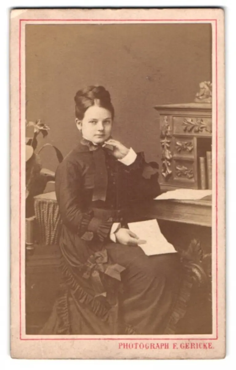 Diese CDV Fotografie zeigt eine elegante Dame, die in einem kunstvoll verzierten Raum an einem Schreibtisch sitzt. Ihr Kleid ist mit feinen Details versehen, und sie hält ein Blatt Papier in der Hand, während sie gedankenverloren in die Ferne blickt. Im Hintergrund sind florale Elemente und Bücher zu erkennen, die eine Atmosphäre von Ruhe und Intellektualität schaffen., guter Zustand Größe ca. 6,5 x 10,5cm