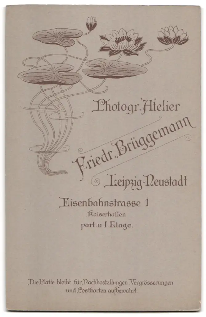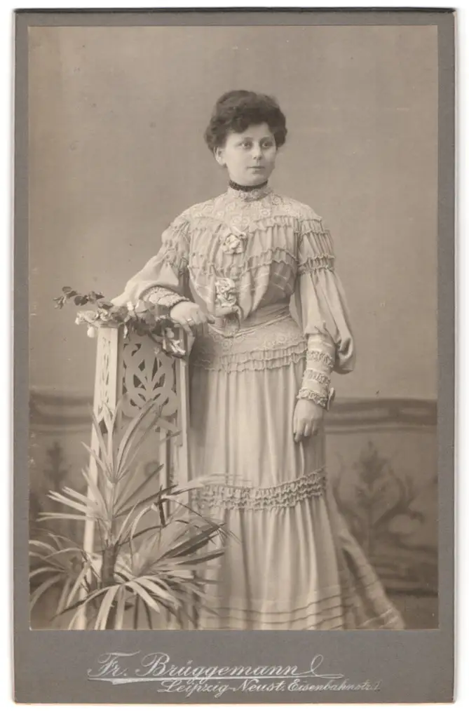 Fotografie Friedr. Brüggemann, Leipzig-Neustadt, Eisenbahnstrasse 1, Frau in Kleid mit Blumenverzierung
