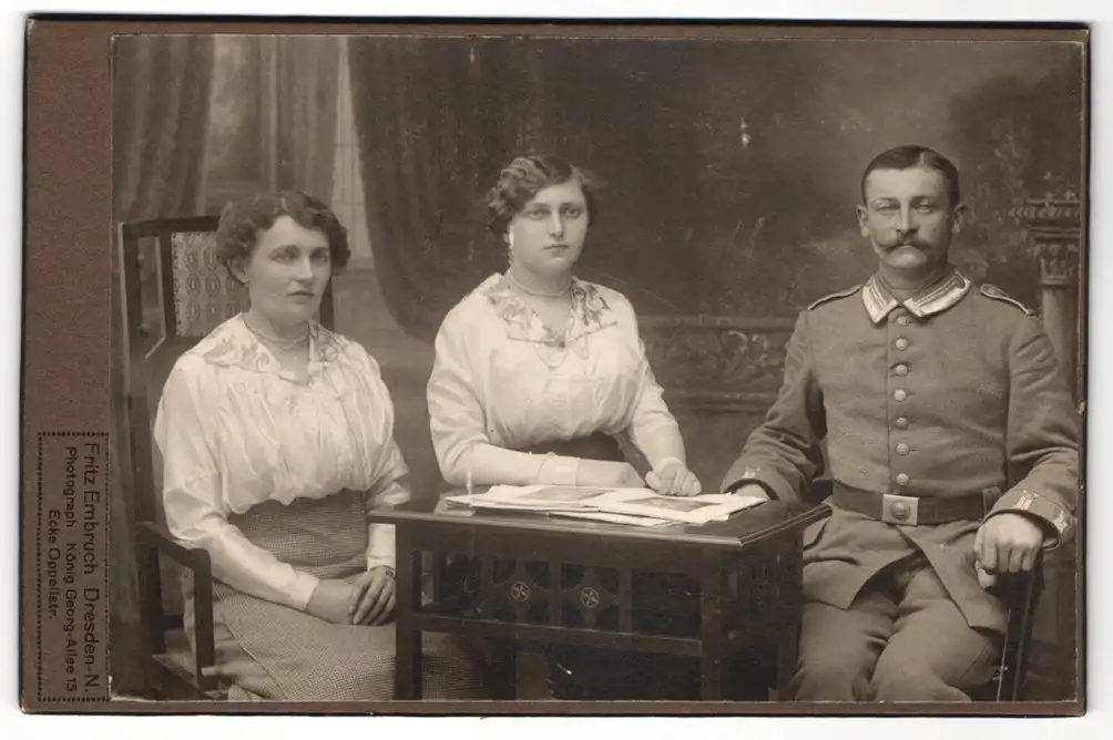 Fotografie Fritz Embruch, Dresden, König Georg-Allee 15, Älterer Gardesoldat in Feldgrau-Uniform mit Ehefrau u. Tochter