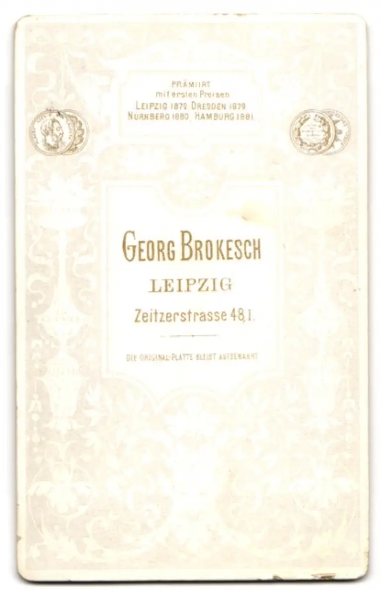 Diese CDV Fotografie zeigt das anmutige Porträt einer Dame aus dem Jahr 1882. Ihr Haar ist kunstvoll zu einem Zopf geflochten, der elegant über ihre Schulter fällt. Das Kleid, das sie trägt, ist mit kunstvollen Details versehen, die durch die feinen Falten und die prächtigen Verzierungen an Kragen und Brustpartie zur Geltung kommen. Ein Anhänger schmückt ihren Hals und fügt dem Gesamtbild eine zusätzliche Nuance von Eleganz hinzu. Diese Darstellung fängt den zeitlosen Charme der Mode des späten 19. Jahrhunderts ein., guter Zustand Größe ca. 6,5 x 10,5cm