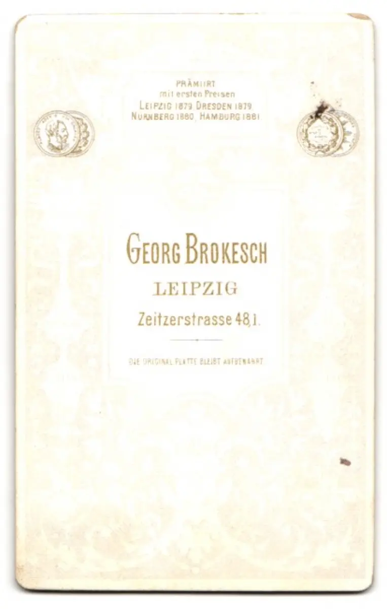 Diese eindrucksvolle CDV Fotografie zeigt das Porträt eines würdevollen Herrn mit einem üppigen Bart. Er trägt einen eleganten Anzug mit feinen Details und eine dezent gebundene Fliege. Sein Blick ist leicht zur Seite gerichtet, was dem Bild eine nachdenkliche und zugleich entschlossene Ausstrahlung verleiht. Die feine Tonalität und der sanfte Kontrast des Bildes unterstreichen die zeitlose Eleganz dieses historischen Augenblicks., guter Zustand