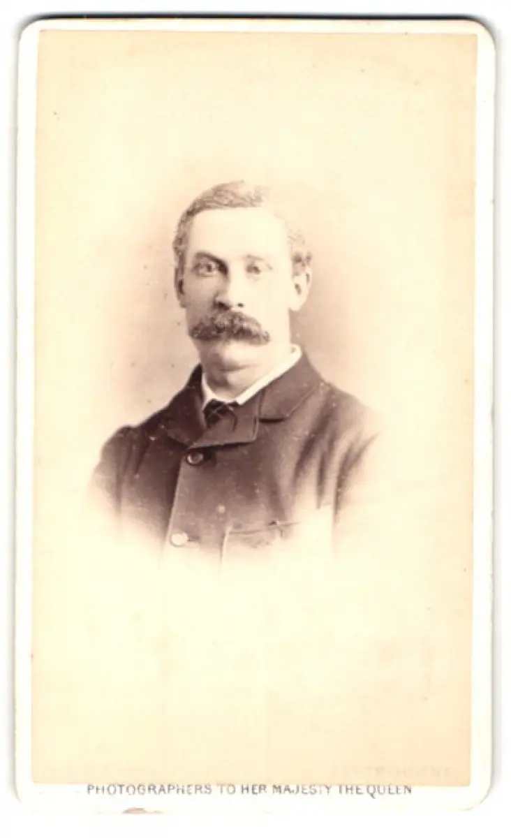Diese CDV Fotografie zeigt das eindrucksvolle Porträt eines Herrn mit markantem Schnurrbart und gepflegtem Haar. Sein ernster Blick zeugt von Selbstbewusstsein und Würde, während er in einem eleganten Anzug mit hohem Kragen posiert. Die weichen Kontraste und die sanfte Beleuchtung verleihen dem Bild eine zeitlose Eleganz und lassen die Persönlichkeit des Abgebildeten lebendig werden., guter Zustand Größe ca. 6,5 x 10,5cm