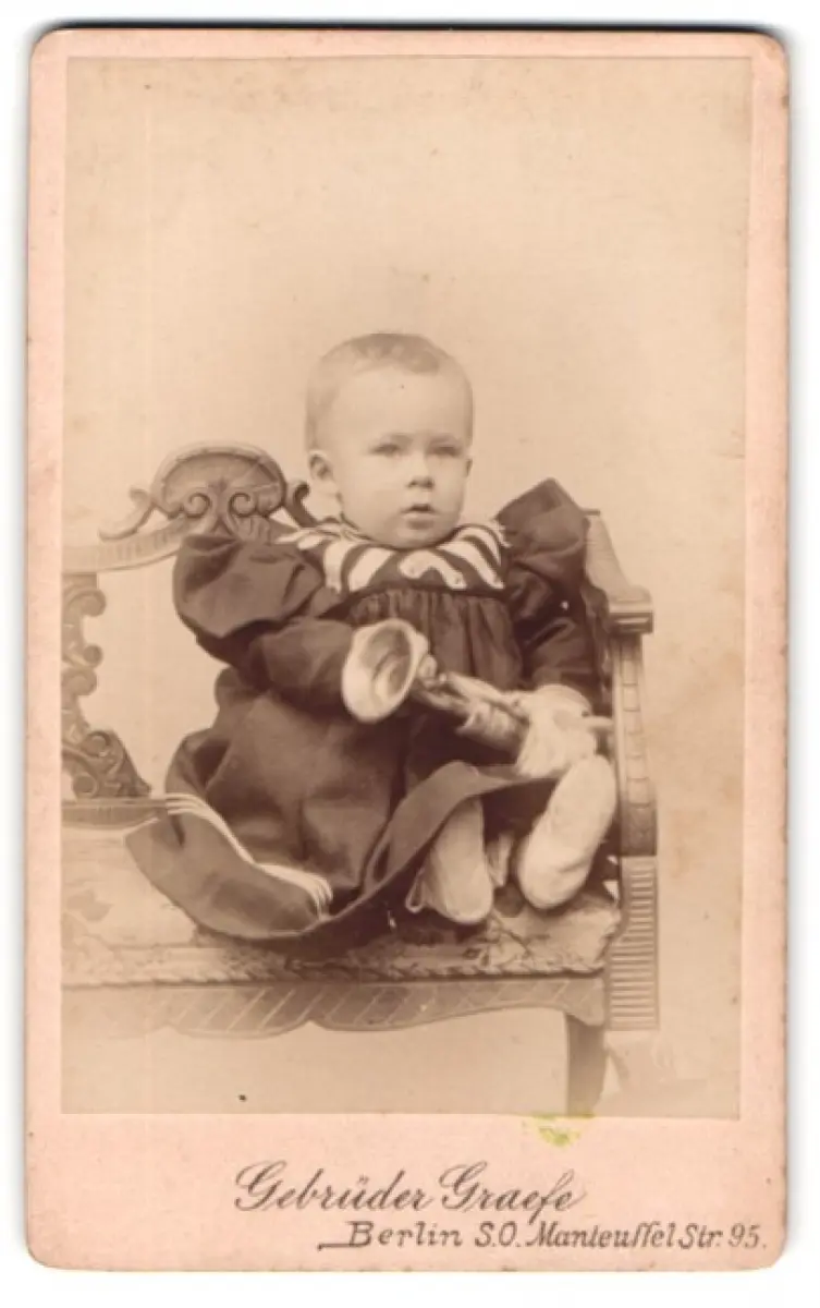 Fotografie Gebrüder Graefe, Berlin, Manteuffelstrasse 95, Portrait eines Kleinkinds mit Spielzeug