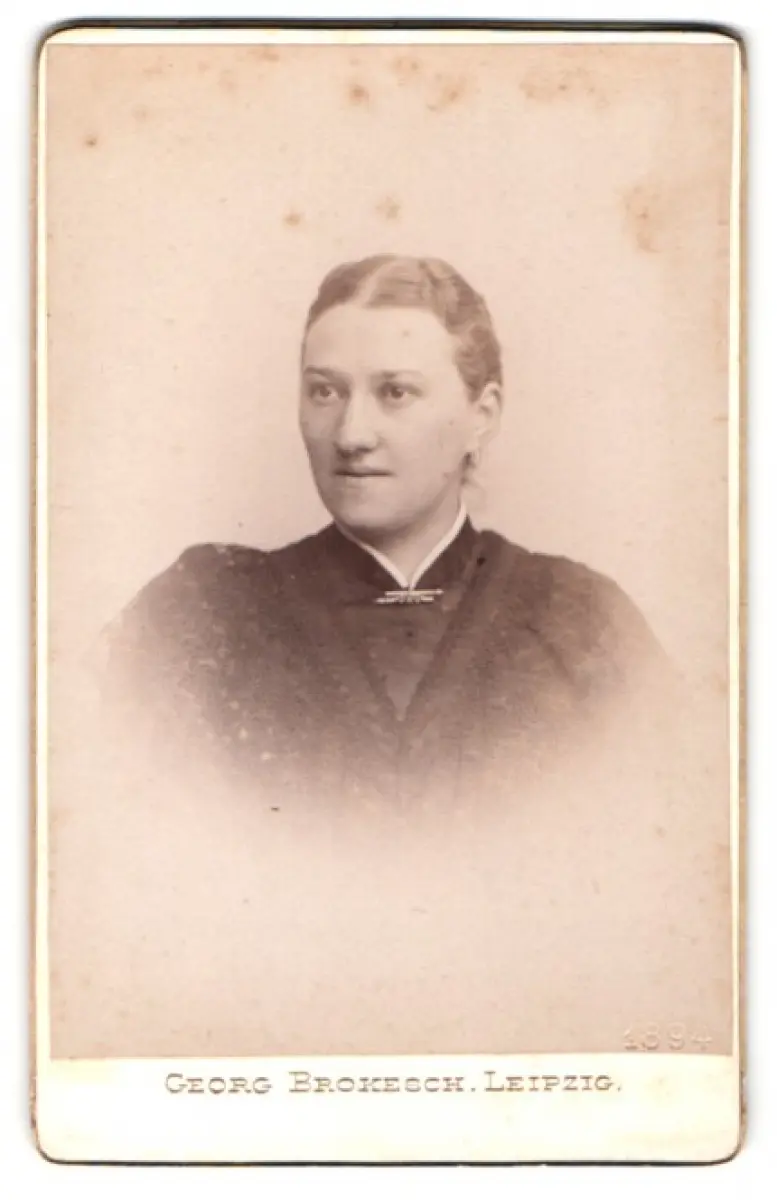 Diese CDV Fotografie offenbart das Porträt einer jungen Frau, deren Gesichtsausdruck Gelassenheit und Anmut ausstrahlt. Ihr Haar ist kunstvoll frisiert und unterstreicht die zeitlose Eleganz der viktorianischen Mode. Der dezente, dunkle Kleidungsstil, ergänzt durch einen feinen Kragen und eine zarte Brosche, verleiht ihr eine würdige und gleichzeitig einnehmende Erscheinung. Dieses Bildnis zeugt von der Kunstfertigkeit der Fotografie jener Ära., guter Zustand