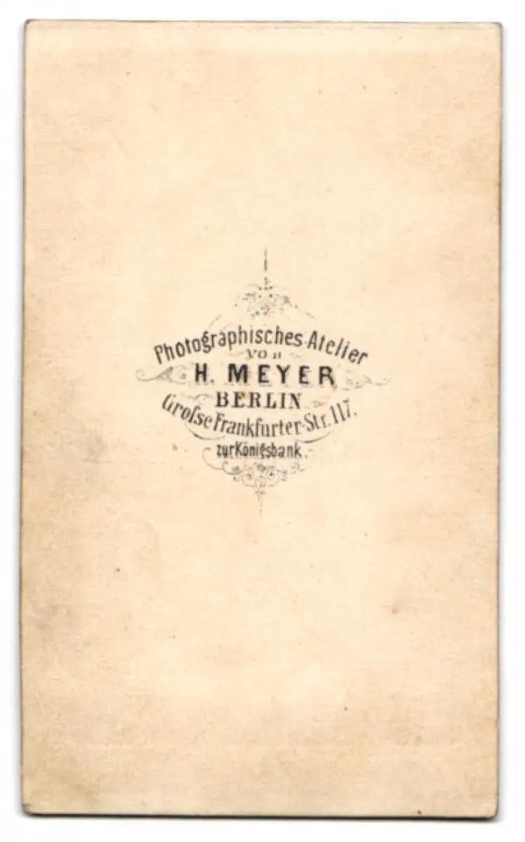 Eine CDV Fotografie, die einen eleganten Herrn zeigt, der selbstbewusst neben einem Stuhl steht. Er trägt einen dunklen Anzug mit Weste und Krawatte, die Sorgfalt und Stilbewusstsein ausstrahlen. In der Hand hält er eine Hut, während im Hintergrund ein malerisches Landschaftsgemälde das Bild harmonisch abrundet. Der Boden ist mit einem geometrischen Muster verziert, das dem Gesamteindruck eine zusätzliche Raffinesse verleiht., guter Zustand Größe ca. 6,5 x 11,0cm