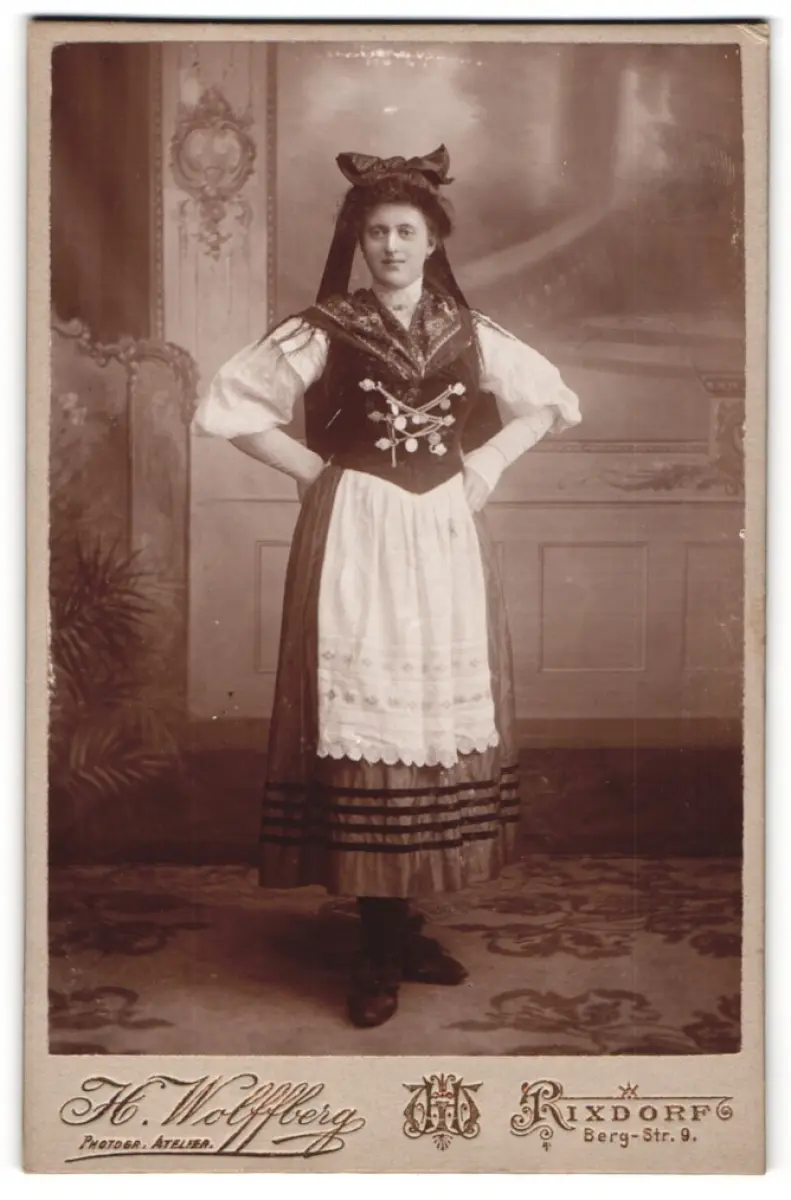 Fotografie H. Wolffberg, Rixdorf, Berg-Strasse 9, Frau in traditioneller Tracht