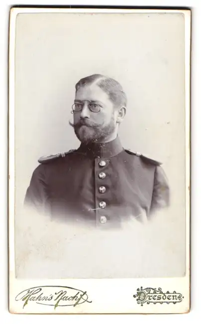 Fotografie Hahn`s Nachf., Dresden, Soldat Curt Hartmann in Uniform mit Epauletten und Zwicker Brille