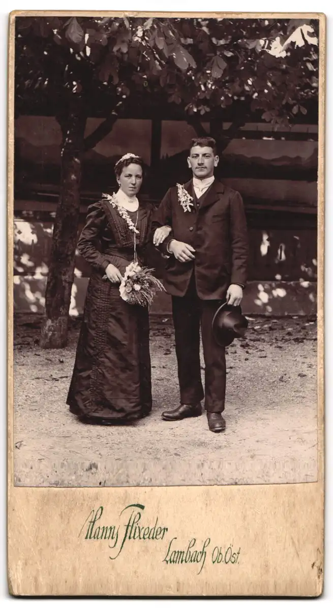 Diese Kabinettfotografie zeigt ein Paar, das in eleganter Kleidung unter einem Blätterdach posiert. Die Dame trägt ein langes, detailliert verziertes Kleid und hält einen Blumenstrauß in den Händen. Der Herr an ihrer Seite ist in einem Anzug gekleidet und hält einen Hut in der Hand. Beide sind mit floralen Accessoires geschmückt, die ihre Kleidung zieren. Der Hintergrund offenbart einen ruhigen, natürlichen Ort, der von Schatten und Licht durchflutet wird., guter Zustand Größe ca. 11,0 x 20,0cm