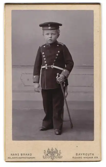 Fotografie Hans Brand, Bayreuth, junger blonder Knabe Otto Bengen als Chevauleger in Uniform mit Säbel