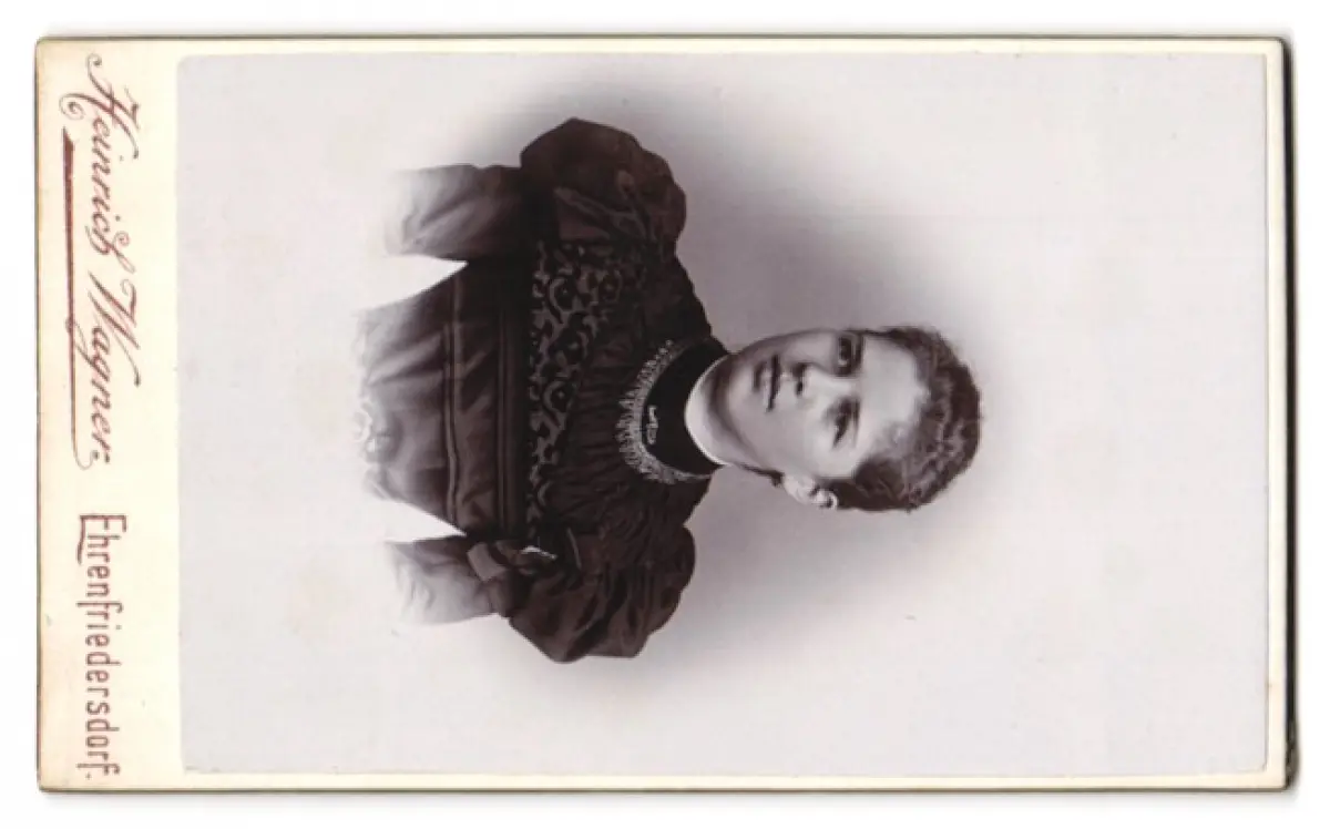 Diese CDV Fotografie zeigt das eindrucksvolle Porträt einer jungen Frau, deren Anmut und Stil der damaligen Zeit Ausdruck verleihen. Ihr Haar ist kunstvoll hochgesteckt, während sie in einem eleganten Kleid mit prachtvollen Details gekleidet ist. Ihr Blick ist ruhig und würdevoll, was dem Bild eine besondere Tiefe verleiht., guter Zustand