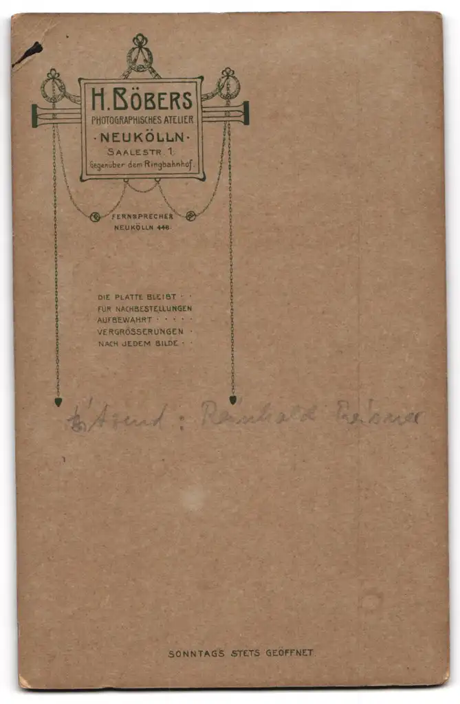 Fotografie Hermann Böbers, Neukölln, Saalestr. 1, Musikkorps-Soldat mit Vogelnestern neben Unteroffizier in Uniform