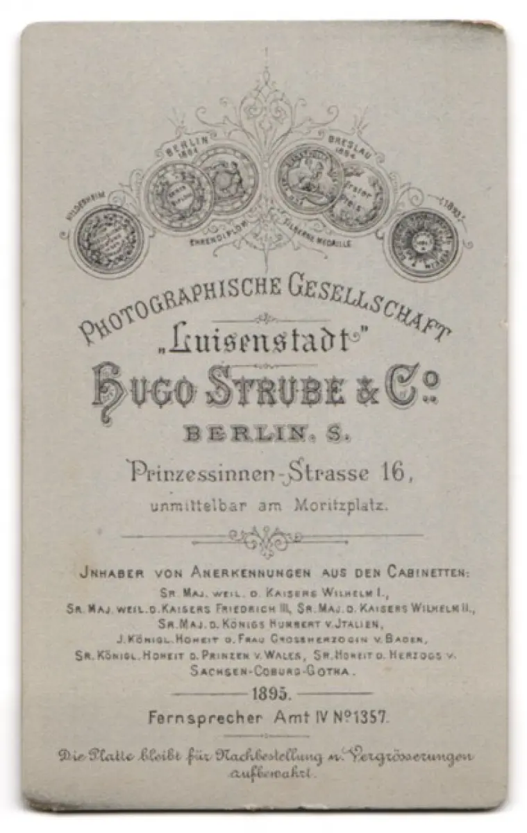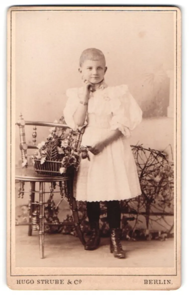 Diese CDV Fotografie zeigt ein junges Kind, das in einem eleganten, weißen Kleid mit Spitzenkragen gekleidet ist. Der kurze Haarschnitt verleiht dem Kind ein frisches Aussehen. Es steht mit einer Hand an eine kunstvoll verzierte Holzstuhllehne gelehnt, während der Hintergrund eine dezente florale Dekoration andeutet. Die Szenerie strahlt eine liebevolle Detailverliebtheit aus, die den Charme der damaligen Zeit einfängt., guter Zustand Größe ca. 6,5 x 10,5cm