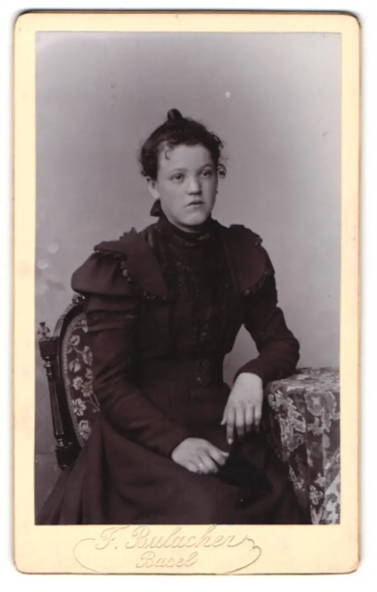 Fotografie J. Bulacher, Basel, Sitzende Dame im dunklen Kleid