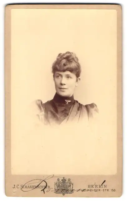 Fotografie J. C. Schaarwächter, Berlin, Leipziger-Str. 130, Portrait junge Frau im Biedermeierkleid mit Locken