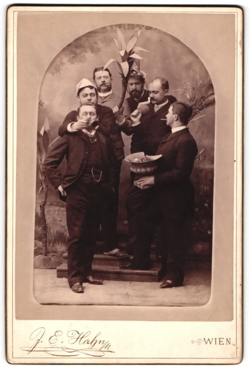 Fotografie J. E. Hahn, Wien, sechs spassige Herren mit Trompete, Papierhut und Palme im Atelier, Schnapschuss