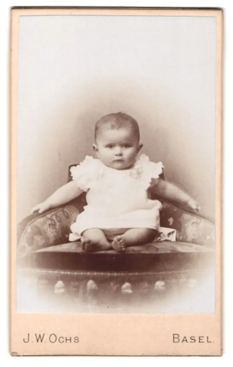 Fotografie J. W. Ochs, Basel, St. Johannvorstadt 35, Porträt eines Kleinkindes auf einem Sessel
