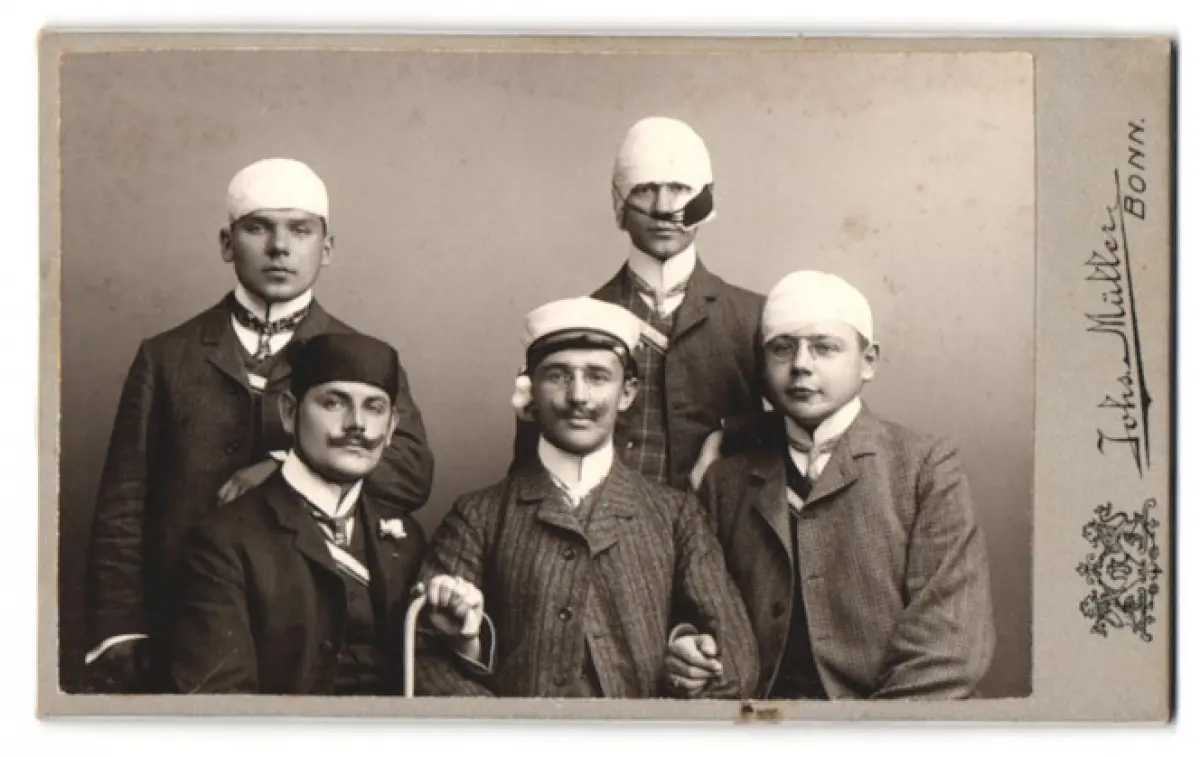 Fotografie Johs. Müller, Bonn, junge Studenten nach der Mensur mit Verbänden