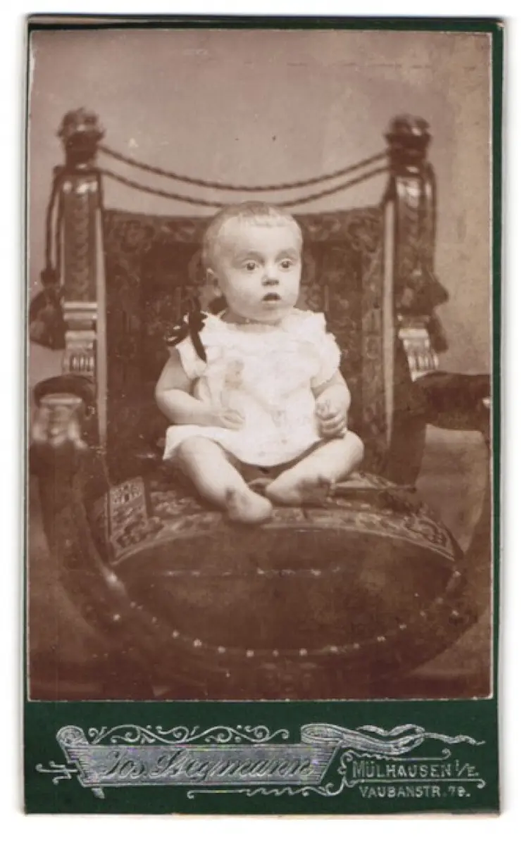 Diese CDV-Fotografie zeigt ein kleines Kind, das auf einem kunstvoll verzierten Stuhl sitzt. Das Kind trägt ein schlichtes weißes Kleid und schaut mit großen, neugierigen Augen in die Ferne. Die Armlehnen des Stuhls weisen aufwendige Schnitzereien auf, die dem Bild eine gewisse Eleganz verleihen. Das Gesamtbild vermittelt einen Eindruck von Ruhe und kindlicher Unschuld., rückseitig Klebe- und Papierreste, guter Zustand Größe ca. 6,5 x 11,0cm