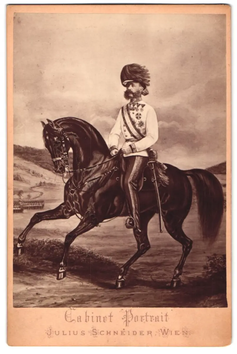 Fotografie Julius Schneider, Wien, Kaiser Franz-Joseph I. von Österreich in Uniform mit Orden zu Pferde