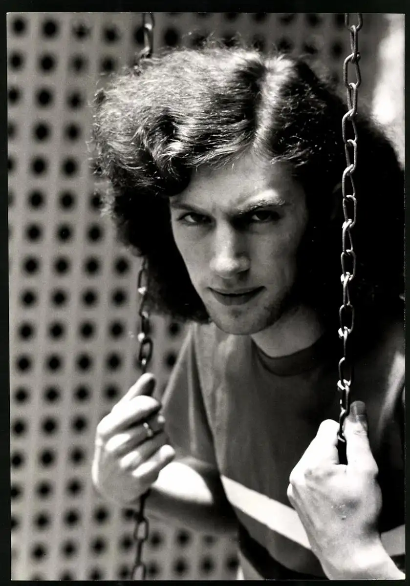 Fotografie Kahana, London, Portrait John Weider von The Animals auf einer Schaukel, Grossformat 21 x 30cm