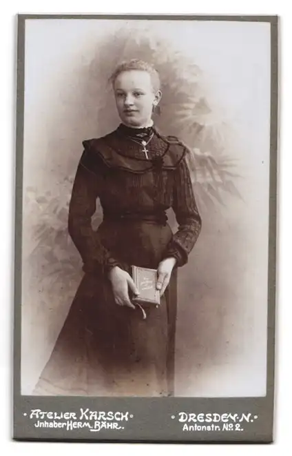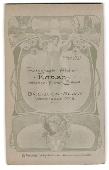 Fotografie Karsch, Dresden-Neustadt, Antonstr. 2, Frau hebt Spiegel in die Luft, Jugendstil Verzierung