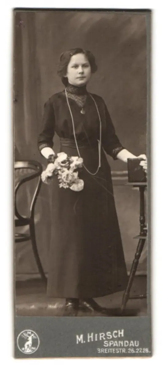 Fotografie M. Hirsch, Spandau, Breitestr. 26, Elegante Dame mit Blumenstrauss