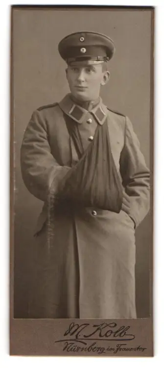 Fotografie M. Kolb, Nürnberg, im Frauentor, verwundeter Uffz. in Uniform Mantel mit Armschlinge