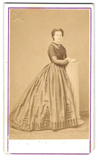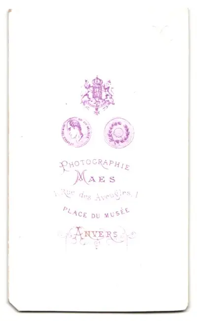 Fotografie Maes, Anvers, 1. Rue des Aveugles, Eine Frau mit übergrossem Kleid steht an einer Säule