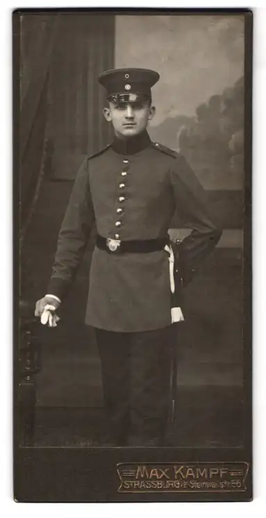 Fotografie Max Kämpf, Strassburg i. E., Steinwallstrasse 56, Junger Soldat in Uniform mit Bajonett und Portepee