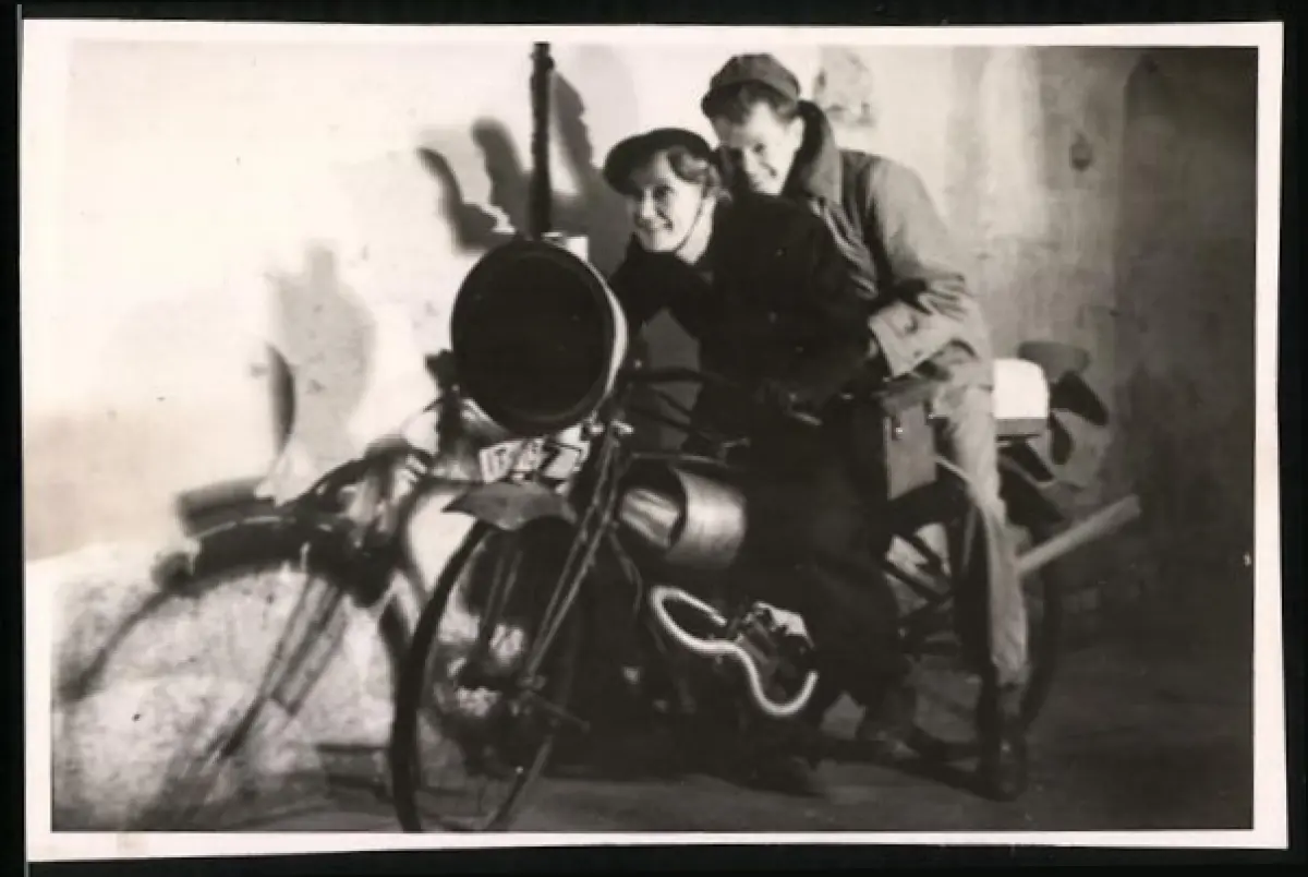 Fotografie Motorrad, Paar auf Krad Eigenbau spielen eine Ausfahrt