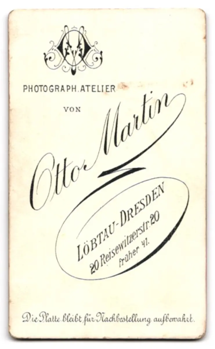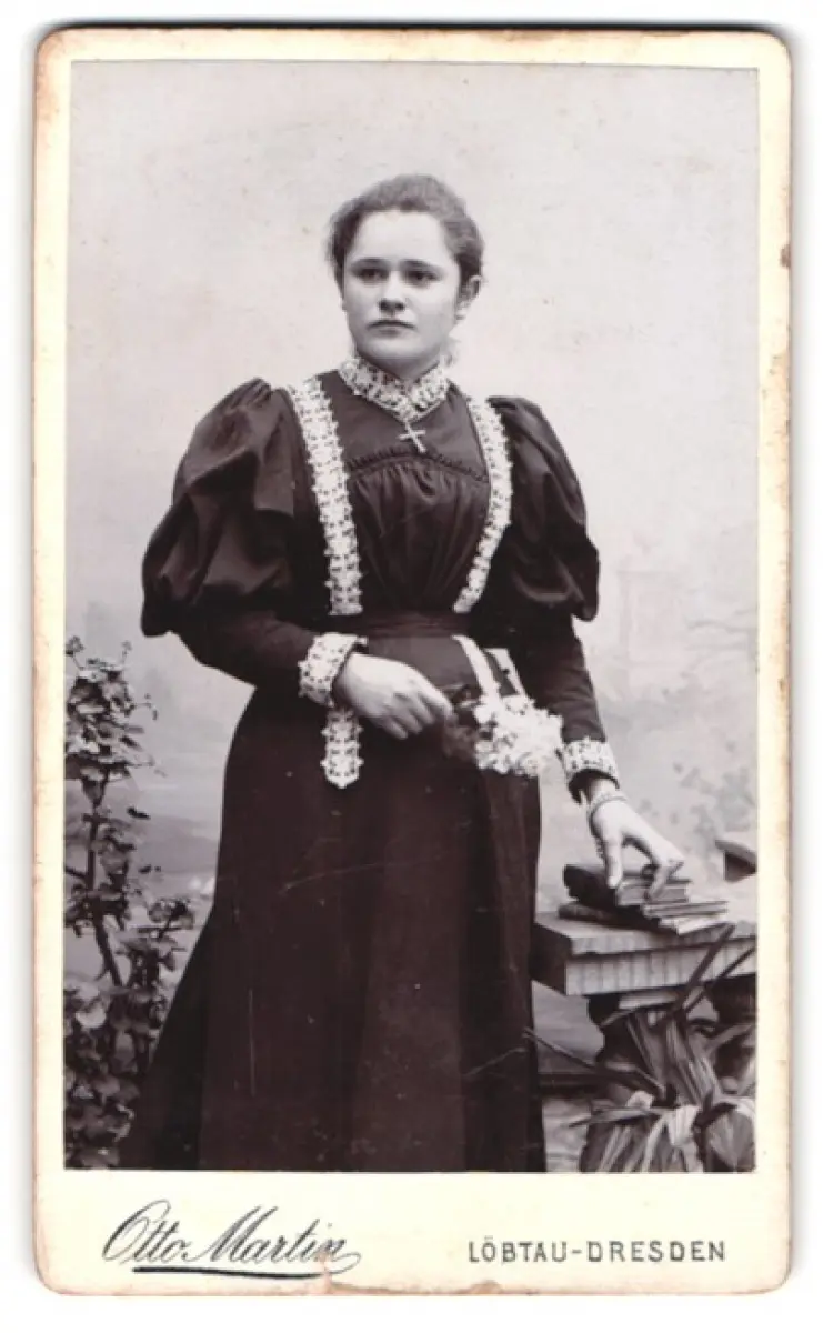 Diese CDV Fotografie fängt den zeitlosen Charme einer Dame in einem eleganten Kleid ein, reich verziert mit Spitzen und einem feinen Muster. Ihr Blick ist nachdenklich und verträumt, die Haare stilvoll hochgesteckt. In ihrer Hand hält sie einen zarten Blumenstrauß, während sie vor einem kunstvollen Hintergrund steht, der einen Hauch von Natur und Architektur kombiniert. Die Komposition des Bildes strahlt eine ruhige Würde und Anmut aus., guter Zustand Größe ca. 6,5 x 10,5cm