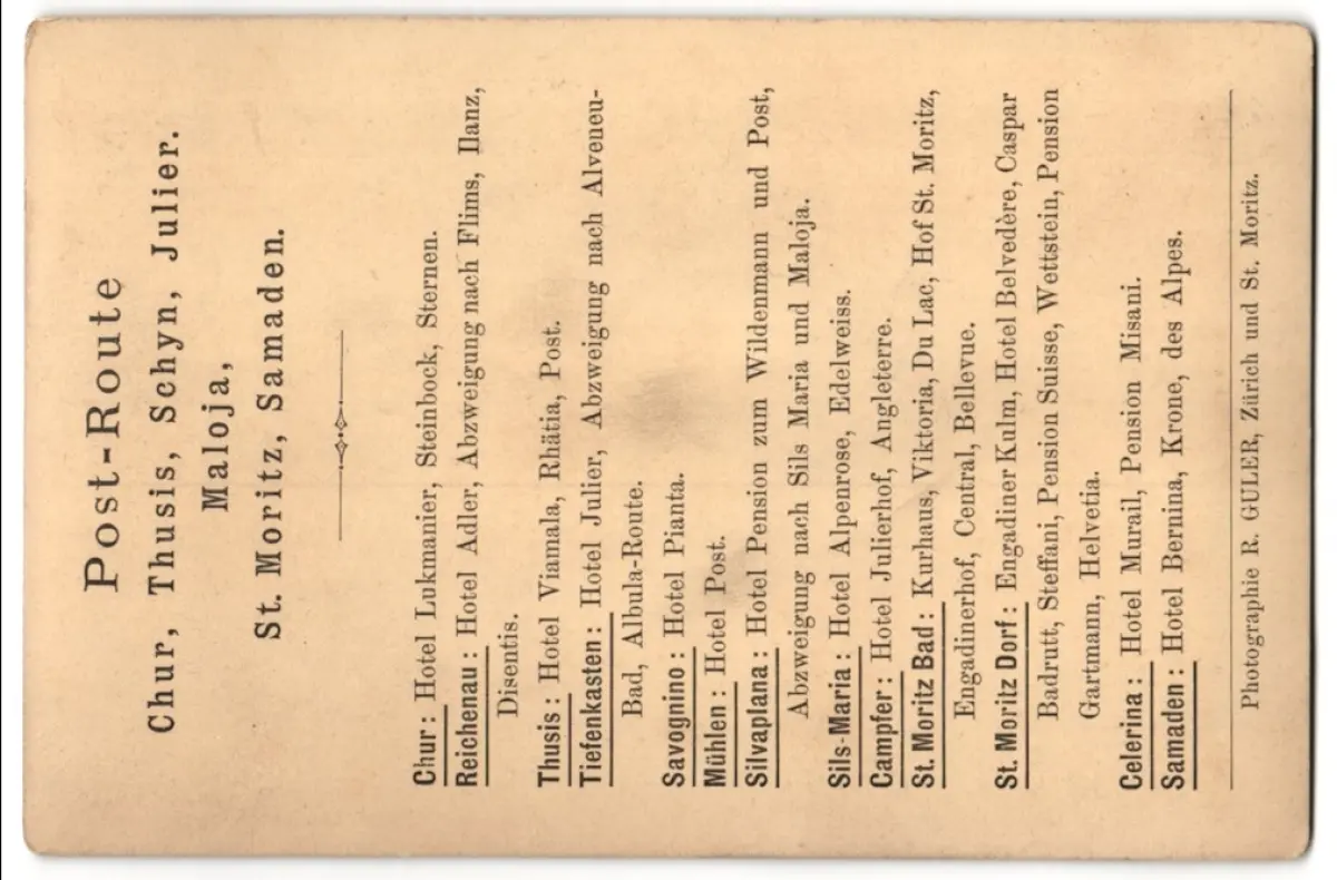 Diese Kabinett Fotografie zeigt ein malerisches Flussufer bei St. Moritz, wo das Wasser des Inns über die Felsen hinabstürzt. Im Hintergrund breitet sich ein ruhiger See aus, eingerahmt von dichten Wäldern und sanften Hügeln. Ein Steg führt über den Fluss und verbindet die Ufer auf anmutige Weise. Die Szenerie fängt die natürliche Schönheit und Ruhe dieser alpinen Landschaft ein und lädt den Betrachter dazu ein, den Augenblick der Stille und Gelassenheit zu genießen., guter Zustand Größe ca. 17,0 x 11,0cm